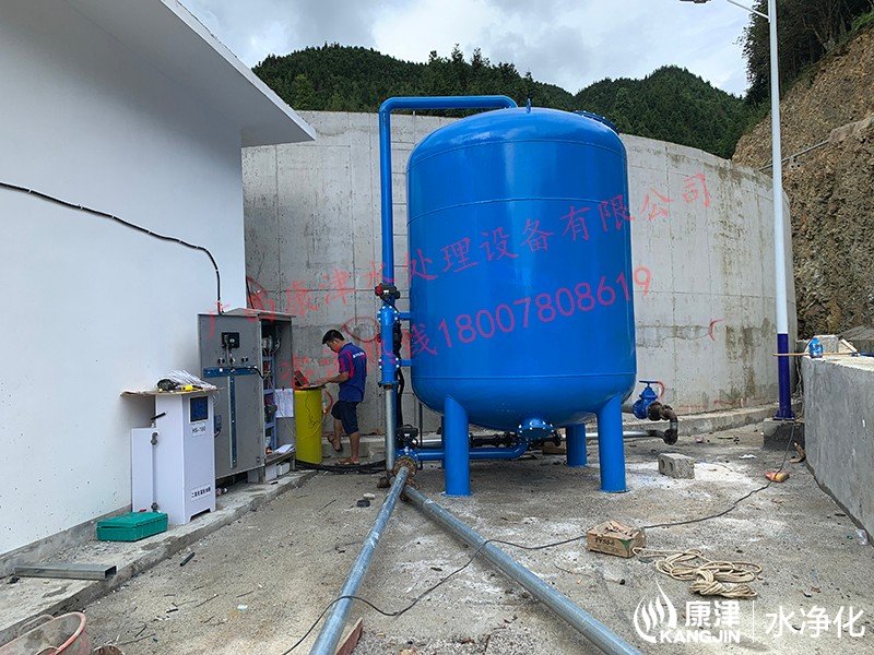 工藝流程:山泉水-絮凝投加器-石英砂過濾器-二氧化氯加藥器-用水點(diǎn)