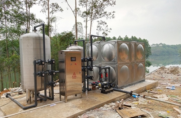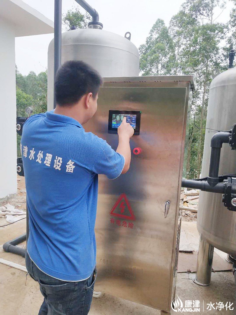 項目名稱:來賓市武宣縣河水凈化工程 設(shè)備名稱:10噸河水壓力式凈水設(shè)備 工藝流程:河水-石英砂過濾器-凈水箱-二氧化氯消毒-加壓泵-高位水塔...