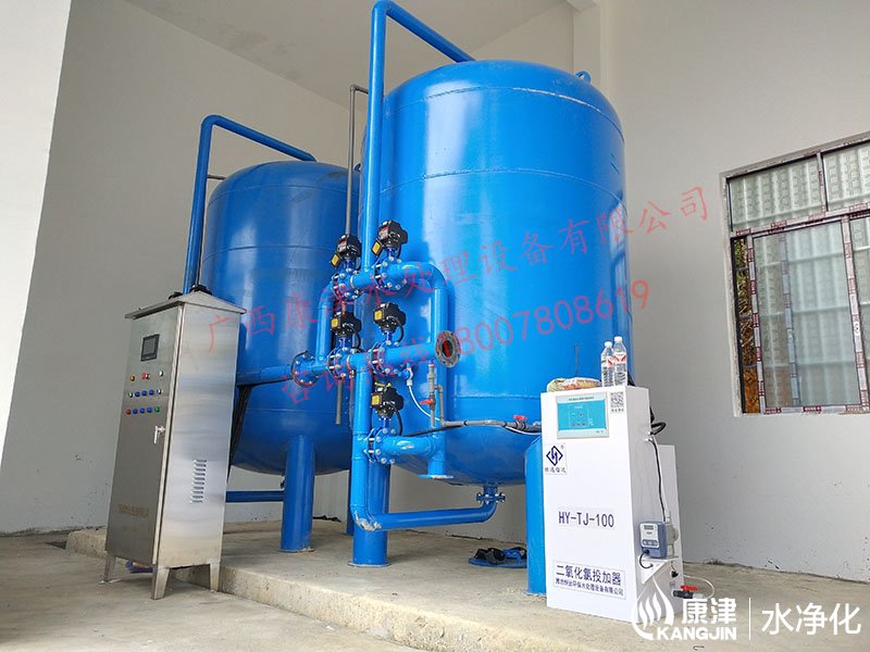 項目名稱:貴港六桂河水凈化工程 設備名稱:30噸壓力式凈水設備 工藝流程:河水-石英砂過濾器(二級過濾)-二氧化氯消毒...