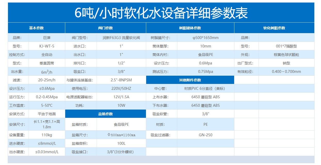 6T/H(每小時(shí)出水 1噸) 全自動(dòng)軟化水設(shè)備,設(shè)備基本上每天處理量40噸水左右,本軟化水設(shè)備采用數(shù)字顯示全自動(dòng)閥門,按流量進(jìn)行再生,具有自動(dòng)化程度高,鹽耗低等特點(diǎn),是鍋爐水軟化、空調(diào)冷卻水、化工用水、賓館、洗衣房、生活用水、紡織行業(yè)、軟化水選用設(shè)備。一、設(shè)備三維效果圖二、設(shè)備常用參數(shù)......