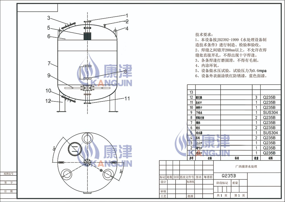 設(shè)備主要由罐體、布水系統(tǒng)、集水系統(tǒng)、濾料層、承托層及內(nèi)部配套管路等組成,外部聯(lián)接原水進(jìn)水、清水出水、反沖洗排水等主要管道和閥門與其相配的控制系統(tǒng)、壓力表、取樣閥等。