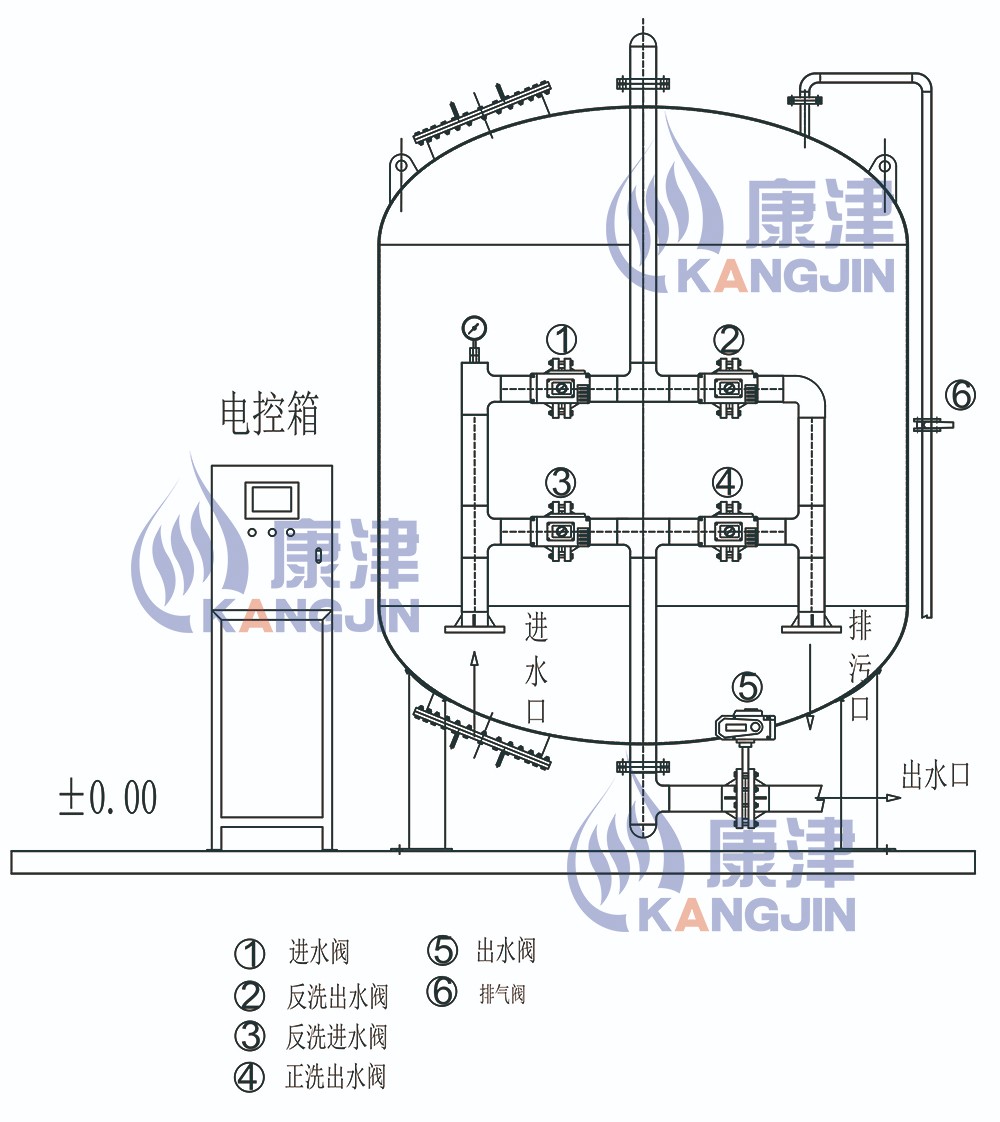 設(shè)備主要由罐體、布水系統(tǒng)、集水系統(tǒng)、濾料層、承托層及內(nèi)部配套管路等組成,外部聯(lián)接原水進(jìn)水、清水出水、反沖洗排水等主要管道和閥門與其相配的控制系統(tǒng)、壓力表、取樣閥等。