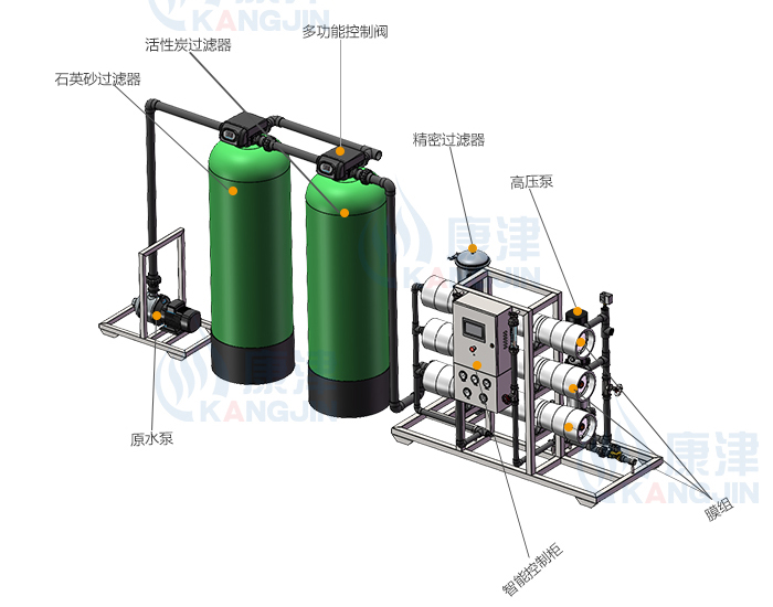 為保證關鍵設備,如:單反滲透裝置的長期可靠穩(wěn)定運行,設置預處理系統,滿足反滲透膜(RO)進水指標:濁度<0.5NTU、SDI<4、余氯<0.1ppm。根據原水水質,預處理系統由原水水箱、原水泵、多介質過濾器、活性炭過濾器、軟化過濾器、保安過濾及相關輔助設備組成。